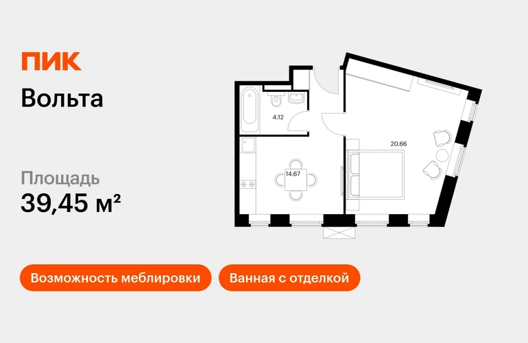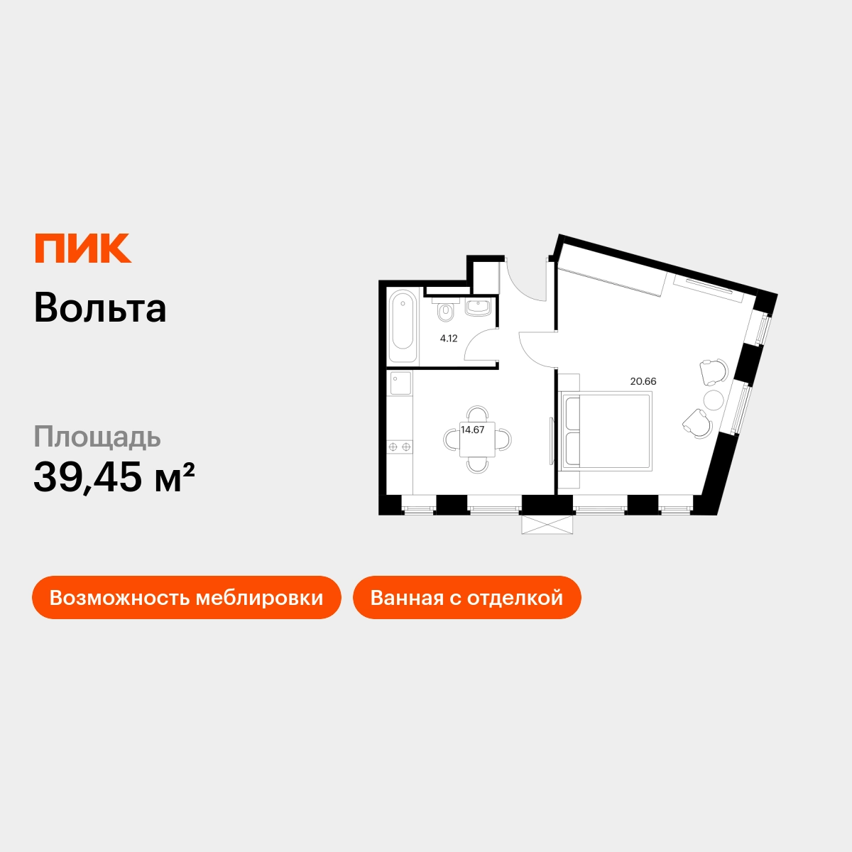 Продаётся 1-комн.апартамент площадью 39.45 кв.м на 2 этаже 15 этажного дома (Вольта, секция 1) проекта ПИК Вольта. Светлый просторный подъезд на уровне земли, функциональная планировка, большие окна, с отделкой. <br> <br>«Вольта» — готовые апартаменты, которые можно приобрести для себя или сдавать через профессиональную управляющую компанию «МТЛ». Она возьмёт на себя заботы по обслуживанию и сдаче в аренду на короткий и длительный срок. <br> <br>Проект расположен недалеко от исторического и делового центра Санкт-Петербурга. Дорога на автомобиле до Невского проспекта займёт 15 минут. До станции метро «Ладожская» получится дойти за 8 минут, до двух остановок общественного транспорта — за минуту. Рядом находятся четыре вокзала и Свердловская набережная. <br> <br>В 15-этажном здании будет 430 апартаментов. На выбор доступны варианты площадью от 19 до 39 м² с готовой отделкой и панорамным видом на реку и город с верхних этажей. <br> <br>На первом этаже предусмотрено просторное дизайнерское лобби, ресторан, круглосуточный ресепшен и кабинет врача. Кроме того, здесь появятся такие сервисы, как химчистка, прачечная, клининг, доставка продуктов, консьерж-сервис. <br> <br>Для прогулок возле реки Охты благоустроят набережную. Для автомобилей предусмотрена парковка и подземный паркинг. Артикул - 818549О застройщике