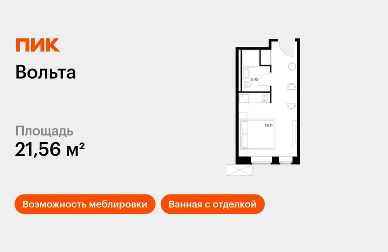 Продаётся апартамент-студия площадью 21.56 кв.м на 2 этаже 15 этажного дома (Вольта, секция 1) проекта ПИК Вольта. Светлый просторный подъезд на уровне земли, функциональная планировка, большие окна, с отделкой. <br> <br>«Вольта» — готовые апартаменты, которые можно приобрести для себя или сдавать через профессиональную управляющую компанию «МТЛ». Она возьмёт на себя заботы по обслуживанию и сдаче в аренду на короткий и длительный срок. <br> <br>Проект расположен недалеко от исторического и делового центра Санкт-Петербурга. Дорога на автомобиле до Невского проспекта займёт 15 минут. До станции метро «Ладожская» получится дойти за 8 минут, до двух остановок общественного транспорта — за минуту. Рядом находятся четыре вокзала и Свердловская набережная. <br> <br>В 15-этажном здании будет 430 апартаментов. На выбор доступны варианты площадью от 19 до 39 м² с готовой отделкой и панорамным видом на реку и город с верхних этажей. <br> <br>На первом этаже предусмотрено просторное дизайнерское лобби, ресторан, круглосуточный ресепшен и кабинет врача. Кроме того, здесь появятся такие сервисы, как химчистка, прачечная, клининг, доставка продуктов, консьерж-сервис. <br> <br>Для прогулок возле реки Охты благоустроят набережную. Для автомобилей предусмотрена парковка и подземный паркинг. Артикул - 818657О застройщике