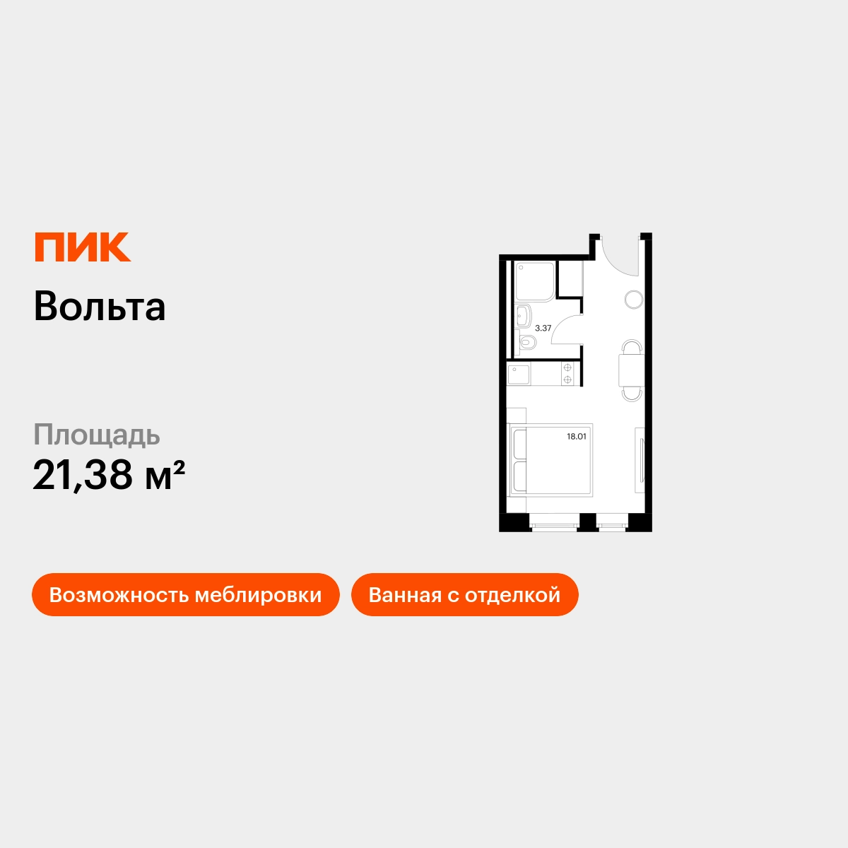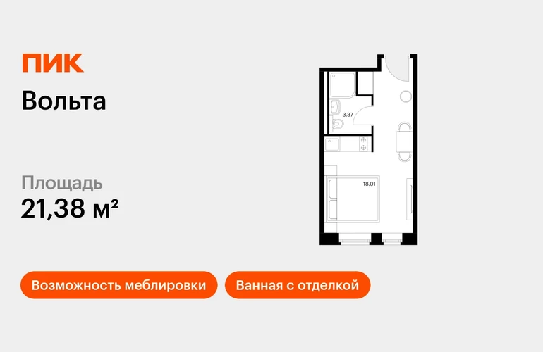Продаётся апартамент-студия площадью 21.38 кв.м на 8 этаже 15 этажного дома (Вольта, секция 1) проекта ПИК Вольта. Светлый просторный подъезд на уровне земли, функциональная планировка, большие окна, с отделкой. <br> <br>«Вольта» — готовые апартаменты, которые можно приобрести для себя или сдавать через профессиональную управляющую компанию «МТЛ». Она возьмёт на себя заботы по обслуживанию и сдаче в аренду на короткий и длительный срок. <br> <br>Проект расположен недалеко от исторического и делового центра Санкт-Петербурга. Дорога на автомобиле до Невского проспекта займёт 15 минут. До станции метро «Ладожская» получится дойти за 8 минут, до двух остановок общественного транспорта — за минуту. Рядом находятся четыре вокзала и Свердловская набережная. <br> <br>В 15-этажном здании будет 430 апартаментов. На выбор доступны варианты площадью от 19 до 39 м² с готовой отделкой и панорамным видом на реку и город с верхних этажей. <br> <br>На первом этаже предусмотрено просторное дизайнерское лобби, ресторан, круглосуточный ресепшен и кабинет врача. Кроме того, здесь появятся такие сервисы, как химчистка, прачечная, клининг, доставка продуктов, консьерж-сервис. <br> <br>Для прогулок возле реки Охты благоустроят набережную. Для автомобилей предусмотрена парковка и подземный паркинг. Артикул - 818764О застройщике