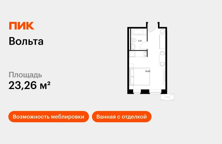 Продаётся апартамент-студия площадью 23.26 кв.м на 10 этаже 15 этажного дома (Вольта, секция 1) проекта ПИК Вольта. Светлый просторный подъезд на уровне земли, функциональная планировка, большие окна, с отделкой. <br> <br>«Вольта» — готовые апартаменты, которые можно приобрести для себя или сдавать через профессиональную управляющую компанию «МТЛ». Она возьмёт на себя заботы по обслуживанию и сдаче в аренду на короткий и длительный срок. <br> <br>Проект расположен недалеко от исторического и делового центра Санкт-Петербурга. Дорога на автомобиле до Невского проспекта займёт 15 минут. До станции метро «Ладожская» получится дойти за 8 минут, до двух остановок общественного транспорта — за минуту. Рядом находятся четыре вокзала и Свердловская набережная. <br> <br>В 15-этажном здании будет 430 апартаментов. На выбор доступны варианты площадью от 19 до 39 м² с готовой отделкой и панорамным видом на реку и город с верхних этажей. <br> <br>На первом этаже предусмотрено просторное дизайнерское лобби, ресторан, круглосуточный ресепшен и кабинет врача. Кроме того, здесь появятся такие сервисы, как химчистка, прачечная, клининг, доставка продуктов, консьерж-сервис. <br> <br>Для прогулок возле реки Охты благоустроят набережную. Для автомобилей предусмотрена парковка и подземный паркинг. Артикул - 818881О застройщике