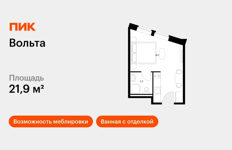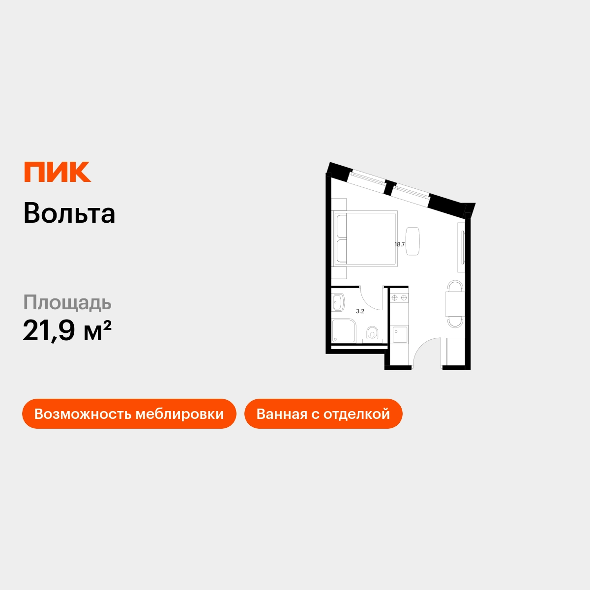 Продаётся апартамент-студия площадью 21.90 кв.м на 7 этаже 15 этажного дома (Вольта, секция 1) проекта ПИК Вольта. Светлый просторный подъезд на уровне земли, функциональная планировка, большие окна, с отделкой. <br> <br>«Вольта» — готовые апартаменты, которые можно приобрести для себя или сдавать через профессиональную управляющую компанию «МТЛ». Она возьмёт на себя заботы по обслуживанию и сдаче в аренду на короткий и длительный срок. <br> <br>Проект расположен недалеко от исторического и делового центра Санкт-Петербурга. Дорога на автомобиле до Невского проспекта займёт 15 минут. До станции метро «Ладожская» получится дойти за 8 минут, до двух остановок общественного транспорта — за минуту. Рядом находятся четыре вокзала и Свердловская набережная. <br> <br>В 15-этажном здании будет 430 апартаментов. На выбор доступны варианты площадью от 19 до 39 м² с готовой отделкой и панорамным видом на реку и город с верхних этажей. <br> <br>На первом этаже предусмотрено просторное дизайнерское лобби, ресторан, круглосуточный ресепшен и кабинет врача. Кроме того, здесь появятся такие сервисы, как химчистка, прачечная, клининг, доставка продуктов, консьерж-сервис. <br> <br>Для прогулок возле реки Охты благоустроят набережную. Для автомобилей предусмотрена парковка и подземный паркинг. Артикул - 818978О застройщике