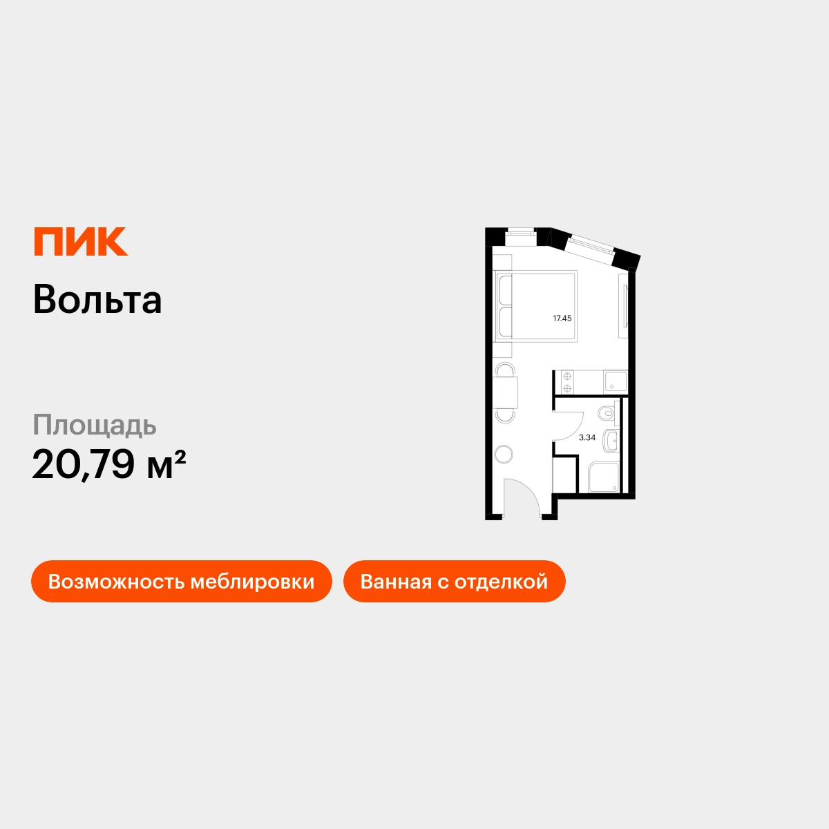 Продаётся апартамент-студия площадью 20.79 кв.м на 5 этаже 15 этажного дома (Вольта, секция 1) проекта ПИК Вольта. Светлый просторный подъезд на уровне земли, функциональная планировка, большие окна, с отделкой. <br> <br>«Вольта» — готовые апартаменты, которые можно приобрести для себя или сдавать через профессиональную управляющую компанию «МТЛ». Она возьмёт на себя заботы по обслуживанию и сдаче в аренду на короткий и длительный срок. <br> <br>Проект расположен недалеко от исторического и делового центра Санкт-Петербурга. Дорога на автомобиле до Невского проспекта займёт 15 минут. До станции метро «Ладожская» получится дойти за 8 минут, до двух остановок общественного транспорта — за минуту. Рядом находятся четыре вокзала и Свердловская набережная. <br> <br>В 15-этажном здании будет 430 апартаментов. На выбор доступны варианты площадью от 19 до 39 м² с готовой отделкой и панорамным видом на реку и город с верхних этажей. <br> <br>На первом этаже предусмотрено просторное дизайнерское лобби, ресторан, круглосуточный ресепшен и кабинет врача. Кроме того, здесь появятся такие сервисы, как химчистка, прачечная, клининг, доставка продуктов, консьерж-сервис. <br> <br>Для прогулок возле реки Охты благоустроят набережную. Для автомобилей предусмотрена парковка и подземный паркинг. Артикул - 818837О застройщике
